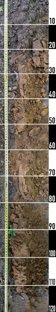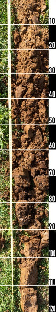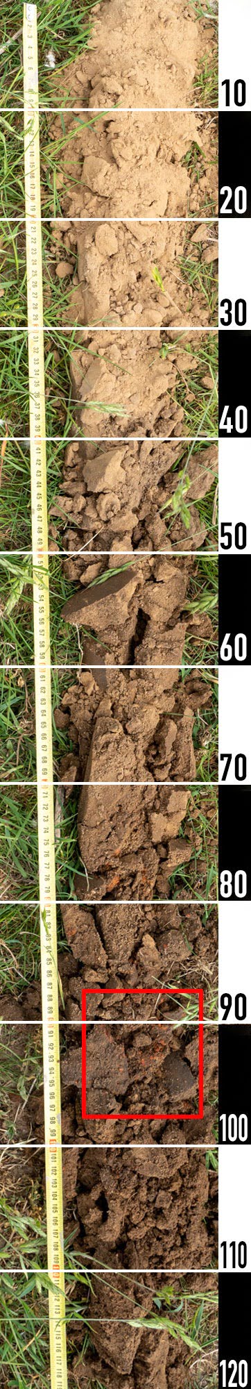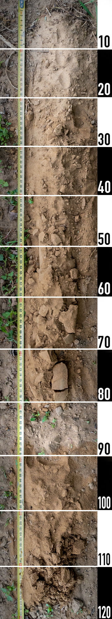 Verstoord profiel door de mens. Dit stuk grond behoort bij het herenhuis Overen en volgens de bewoner zijn op deze plek in het verleden gaten en kuilen in het terrein opgevuld. Tussen 75 en 100 cm zitten rode stukjes van baksteen die waarschijnlijk afkomstig zijn van het puin dat is gebruikt bij het opvullen. Zie detailfoto: