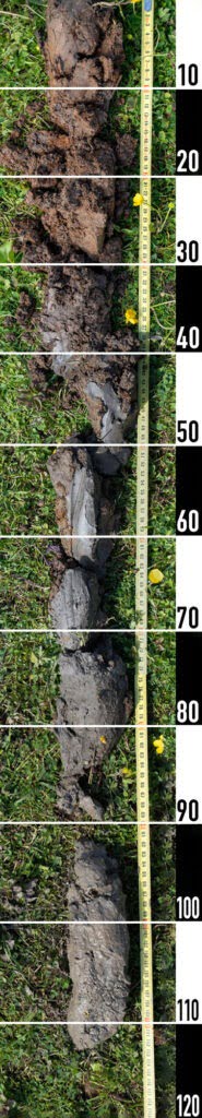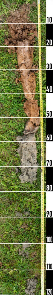 -35/-115 cm: grijze, zeer natte klei, permanent onder water dus geen oxidatie van ijzer.