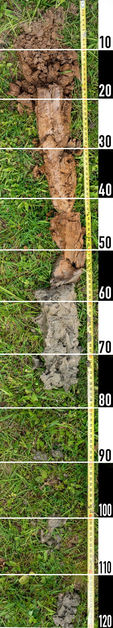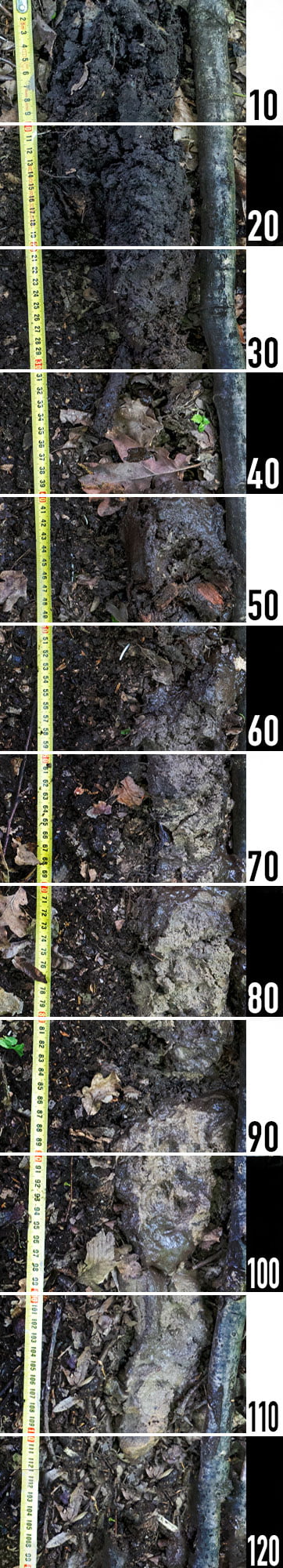 > 70 cm: grondwater waardoor weinig materiaal mee naar boven kwam