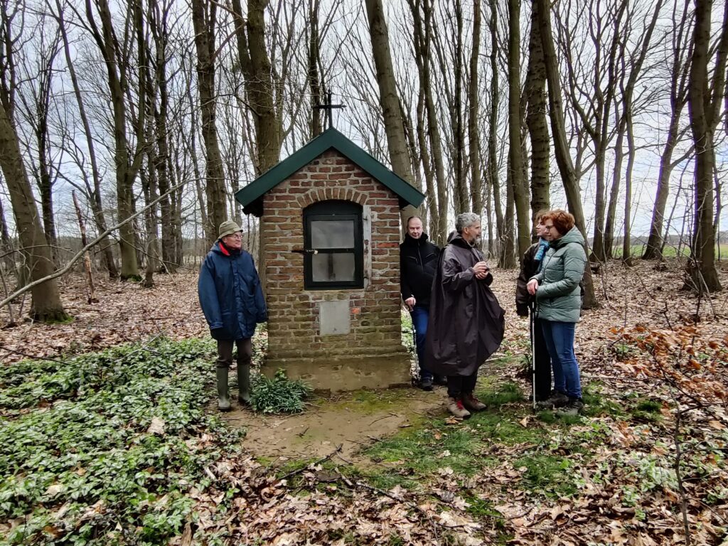 Op zaterdag zijn we (12 personen) vanaf de basiliek richting het Hagelkruis (naast de Hagelkruisweg, vlak voor Huize Hoosden) naar het oude tracé van de Gulikerweg, richting de dassenburcht gegaan. Op dit stuk is een mooie doorkijk in het Broekbos. Dit kan nu nog, omdat er geen bladeren aan de bomen en struiken zitten. In de laatste 70 jaar is dit gebied drastisch veranderd, van open land, met volkstuintjes tot een broekbos.